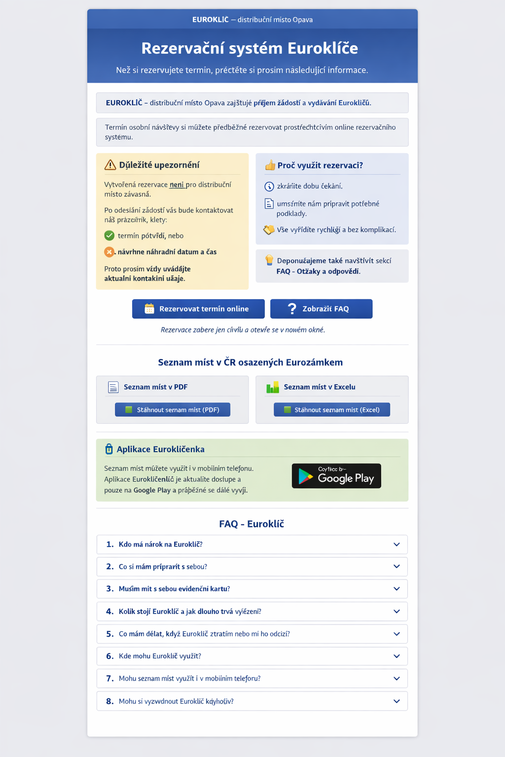 Služba EUROKLÍČ, distribuční místo Opava, která je vedlejší činností naší organizace, nově nabízí možnost rezervace termínu prostřednictvím online rezervačního systému.